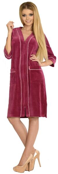 Meleg, rövid női fürdőköpeny kellemes velúr típusú pamut anyagból. Cipzárral kötődik, mindkét oldalán praktikus zsebek találhatók. A fürdőköpeny meleg érzést biztosít a fürdőzés után. Vigye magával nyaralásra vagy wellness tartózkodásra. Anyaga: 80% pamut, 20% poliészter