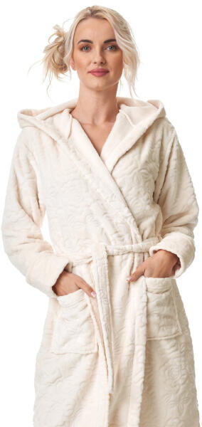 Hosszú női fürdőköpeny Szuper puha kötött anyag Dombornyomott, dombornyomott minta Kapucnival Hosszú ujj Derékban nyakkendő Oldalán varrott zsebek Összetétel: 100% poliészter