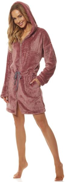 Női fürdőköpeny kapucnival. Szép gyapjú szövet. Cipzáros rögzítés. A derékban húzózsinór a kerület beállításához. Kényelmes oldalzsebek. Anyaga: 100% poliészter