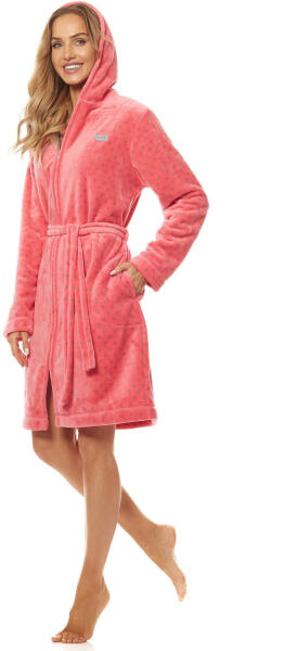Kényelmes női fürdőköpeny Puha pontozott kötött anyagból készült Kapucnival Cipzáros záródás Gyengéd felvitel a mellkasra Derékban nyakkendő Oldalsó zsebek Anyaga: 100% poliészter
