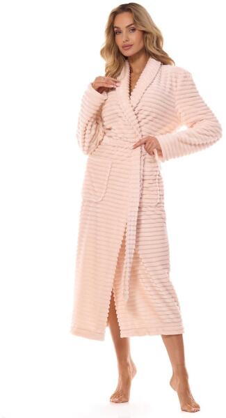 Hosszú női fürdőköpeny - puha, meleg kötöttáru - vízszintes emelt csíkokkal strukturált - kendőgallér - hosszú ujjú - derékban megkötés - kényelmes zsebek az oldalán Összetétel: 100% poliészter