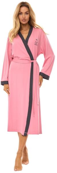 Hosszú női fürdőköpeny - kiváló minőségű, finom viszkóz kötött - mandzsetta és szegély kontrasztos színű csövekkel - finom hímzés a mellkas szintjén - hosszú ujjú - derékban megkötés - kényelmes zsebek az oldalán - térd hossza Összetétel: 100% viszkóz