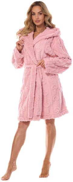 Rövid női fürdőköpeny kapucnival - puha anyag domborműves, dombornyomott mintával - hosszú ujjú - derékban megkötés - két külső zseb Összetétel: 100% poliészter