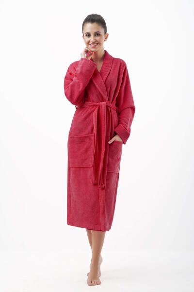 Hosszú női pamut fürdőköpeny széles gallérral. Derékban övvel van megkötve, mindkét oldalán praktikus zsebek találhatók. A meleg fürdőköpeny meleg meleg érzést kölcsönöz a testnek fürdés után. Vigye magával nyaralásra vagy wellness tartózkodásra. Anyaga: 80% pamut, 20% poliészter